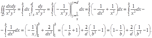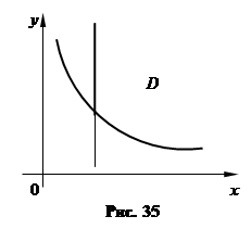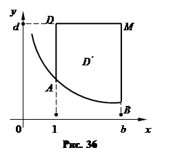 Пример 20. Исследовать, сходится ли двойной интеграл Данный двойной интеграл является несобственным, поскольку область интегрирования – бесконечная часть первого квадрат, ограниченная слева прямой х = 1 и снизу гиперболой ху = 1 (рис. 35). Рассмотрим конечную часть области D – область D’, ограниченную линиями х = 1, х = b,
