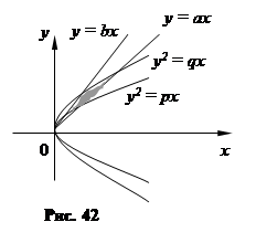 Пример 29. Найти площадь фигуры, ограниченной линиями у2 = 2 рх, у2 = qx, у = ах, у = bх (0 < p < q, 0 < a < b). Фигура представляет собой криволинейный четырехугольник, ограниченный двумя параболами и двумя прямыми, проходящими через начало координат (рис. 42). Введем новые криволинейные координаты u, v, связанные с координатами х и у формулами: