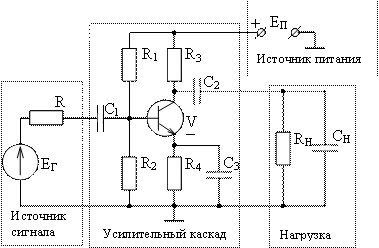 Из-за того, что выходное напряжение практически равно входному напряжению, каскад с общим коллектором часто называют эмиттерным повторителем. Каскад имеет большое входное Rвх и малое выходное Rвых сопротивления из-за 100% последовательной по входу и параллельной по выходу отрицательной обратной связи. При большом сопротивлении базового делителя имеем: