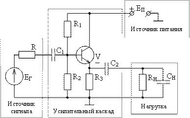 22) усилительный каскад с общим коллектором. При включении в цепь транзистора с общим коллектором возникает наибольшее входное сопротивление, до сотен килоом, которое увеличивается при возрастании сопротивления нагрузки. Выходное сопротивление такого вида включения меньше, чем при других, принимает значение в пределах от десятых долей ома до тысячи и резко увеличивается при возрастании внутреннего сопротивления источника сигнала. Коэффициент усиления напряжения в случае включения транзистора с общим коллектором меньше единицы,коэффициент усиления тока немного больше, чем при включении с общим эмиттером, и сильно меняется при изменении режима работы, температуры и замене транзисторов. Выходной сигнал этой схемы совпадает по фазе с входным сигналом. Включение с общим коллектором применяется в каскадах предварительного усиления при условии необходимости большого входного сопротивления и малой входной емкости, а также в каскадах с большой выходной мощностью, с малым входным сопротивлением или малыми нелинейными искажениями.В силу того, что выход сопутствует току эмиттера, эту схему иногда называют эмиттерным повторителем. Каскады с общим коллектором (ОК) обычно применяются для согласования высокоомного источника сигнала и низкоомной нагрузки. В этом каскаде выходное напряжение снимается с резистора R3, включенного в цепь эмиттера.