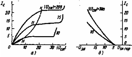 Если к транзистору с ОИ подключить напряжение Uси, по цепи стока пойдет обратный ток р-n- перехода, значение которого очень мало. При подключении в цепь затвора напряжения Uзи так, чтобы потенциал затвора относительно истока и пластины был обязательно отрицательным (для транзистора на рисунке 3.23), под действием электрического поля под затвором приповерхностный слой пластины полупроводника обеднится. Если Uзи достигнет определенного значения, называемого пороговым Uпор, то слой полупроводника под затвором настолько обеднится, что произойдет его инверсия: образуется канал р -типа, который соединит обе области р -типа. Если Uси не равно 0, по каналу потечет ток стока. Изменяя напряжение на затворе, можно менять толщину и поперечное сечение канала и тем самым его сопротивление, а следовательно, и ток стока. На значение IС влияет также напряжение Ucи. При этом изменяется и форма канала. Семейство выходных статических характеристик (а) аналогично семейству выходных характеристик транзистора с управляющим p-n- переходом. Однако характеристика для Uзи =0 в этом случае отсутствует, так как канал индуцируется при Uзи>Uпор. Переходные характеристики (б) IС = f(Uзи) при Ucи=соnst. Они сдвинуты относительно нуля координат на Uпор.