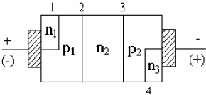 Переходы П1 и П3 включены в прямом направлении; их называют эмиттерными. Переход П2 коллекторный, он включен в обратном направлении. Таким образом, структура содержит две эмиттерные области (n и p - эмиттеры) и две базовые (n и p - базы). В такой структуре реализуется внутренняя положительная обратная связь, которая приводит к переключению.