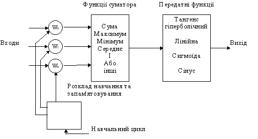 Входные сигналы xn взвешенные весовыми коэффициентами соединения wn складываются, проходят через передаточную функцию, генерируют результат и выводятся. В имеющихся сейчас пакетах программ искусственные нейроны называются "элементами обработки" и имеют больше возможностей, чем простой искусственный нейрон, описанный выше. На рисунке ниже изображенная детальная схема упрощенного искусственного нейрона.
