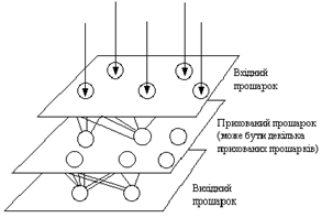 На рисунке ниже показана типичная структура искусственных нейросетей. Хотя существуют сети, которые содержат лишь один слой, или даже один элемент, большинство реализаций используют сети, содержащих как минимум три типа слоев - входной, скрытый и выходной. Слой входных нейронов получает данные или из входных файлов, или непосредственно с электронных датчиков. Выходной слой пересылает информацию непосредственно во внешнюю среду, ко вторичному компьютерному процессу, или к другому устройству. Между этими двумя слоями может быть несколько скрытых слоев, содержащих много разнообразно связанных нейронов. Входы и выходы каждого из скрытых нейронов соединены с другими нейронами.