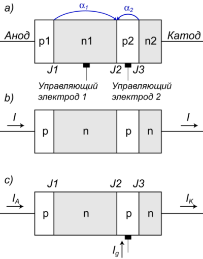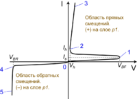 Характеристики тиристоров. Современные тиристоры изготовляют на токи от 1 мА до 10 кА напряжения от нескольких В до нескольких кВ; скорость нарастания в них прямого тока достигает 109 А/сек, напряжения — 109 В/сек, время включения составляет величины от нескольких десятых долей до нескольких десятков мкс, время выключения — от нескольких единиц до нескольких сотен мкс; кпд достигает 99 %. Вольт-амперные характеристики тиристора и симистора 1) ВАХ тиристора (с управляющими электродами или без них) приведена на рис 2. Она имеет несколько участков: 2) Между точками 0 и 1 находится участок, соответствующий высокому сопротивлению прибора — прямое запирание. 3) В точке 1 происходит включение тиристора. 4) Между точками 1 и 2 находится участок с отрицательным дифференциальным сопротивлением. 5) Участок между точками 2 и 3 соответствует открытому состоянию (прямой проводимости). 6) В точке 2 через прибор протекает минимальный удерживающий ток Ih. 7) Участок между 0 и 4 описывает режим обратного запирания прибора. 8) Участок между 4 и 5 — режим обратного пробоя. 9) самое полезное свойство тиристора, симистора и других приборов с отрицательным обратным сопротивлением: переключенные в состояние с малым сопротивлением, они остаются в этом состоянии сколь угодно долго, даже после снятия управляющего сигнала, вплоть до падения тока нагрузки ниже тока удержания. Это позволяет управлять симисторами и тиристорами короткими импульсами управляющего напряжения. Режимы работы тиристора.