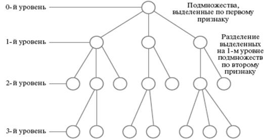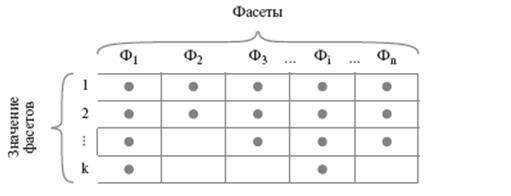 Рис. 12 Иерархическая классификационная схема Недостатки, отмеченные в иерархической системе, отсутствуют в других системах, которые относятся к классу многоаспектных систем классификации. Аспект — точка зрения на объект классификации, который характеризуется одним или несколькими признаками. Многоаспектная система — это система классификации, которая использует параллельно несколько независимых признаков (аспектов) в качестве основания классификации. Существуют два типа многоаспектных систем: фасетная и дескрипторная. Фасет — это аспект классификации, который используется для образования независимых классификационных группировок. Дескрипто р — ключевое слово, определяющее некоторое понятие, которое формирует описание объекта и дает принадлежность этого объекта к классу, группе и т.д. Под фасетным методом классификации понимается «параллельное разделение множества объектов на независимые классификационные группировки». При этом методе классификации заранее жесткой классификационной схемы и конечных группировок не создается. Разрабатывается лишь система таблиц признаков объектов классификации, называемых фасетами. При необходимости создания классификационной группировки для решения конкретной задачи осуществляется выборка необходимых признаков из фасетов и их объединение в определенной последовательности. Общий вид фасетной классификационной схемы представлен на рис. 13.