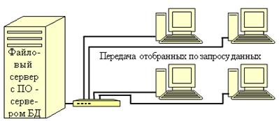 Рис. 15. Схема работы с БД в в архитектуре "Файл-сервер" Плюсы: · низкая стоимость разработки; · высокая скорость разработки; · невысокая стоимость обновления и изменения ПО. Минусы: · низкая производительность (зависит от производительности сети, сервера, клиента); · ограниченность языка; · негибкость среды разработки. Клиент-сервер (см. рис. 16). Клиент-сервер - вычислительная или сетевая архитектура, в которой задания или сетевая нагрузка распределены между поставщиками услуг (сервисов), называемыми серверами, и заказчиками услуг, называемыми клиентами. Нередко клиенты и серверы взаимодействуют через компьютерную сеть и могут быть как различными физическими устройствами, так и программным обеспечением[HH].