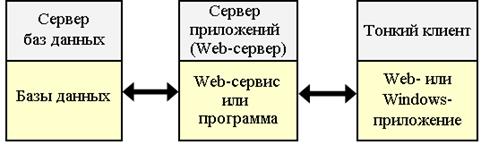 Рис. 16. Схема работы с БД в архитектуре "Клиент-сервер" Плюсы: · Делает возможным, в большинстве случаев, распределение функции вычислительной системы между несколькими независимыми компьютерами в сети. Это позволяет упростить обслуживание вычислительной системы. В частности, замена, ремонт, модернизация или перемещение сервера не затрагивают клиентов. · Все данные хранятся на сервере, который, как правило, защищён гораздо лучше большинства клиентов. На сервере проще обеспечить контроль полномочий, чтобы разрешать доступ к данным только клиентам с соответствующими правами доступа. · Позволяет объединить различные клиенты. Использовать ресурсы одного сервера часто могут клиенты с разными аппаратными платформами, операционными системами и т. п. Минусы: · Неработоспособность сервера может сделать неработоспособной всю вычислительную сеть. · Поддержка работы данной системы требует отдельного специалиста - системного администратора. · Высокая стоимость оборудования. Трехуровневая архитектура функционирует в Intranet- и Internet-сетях. Клиентская часть ("тонкий клиент"), взаимодействующая с пользователем, представляет собой HTML-страницу в Web-браузере либо Windows-приложение, взаимодействующее с Web-сервисами. Вся программная логика вынесена на сервер приложений, который обеспечивает формирование запросов к базе данных, передаваемых на выполнение серверу баз данных. Сервер приложений может быть Web-сервером или специализированной программой (например, Oracle Forms Server) (см. рис. 14) [FF].