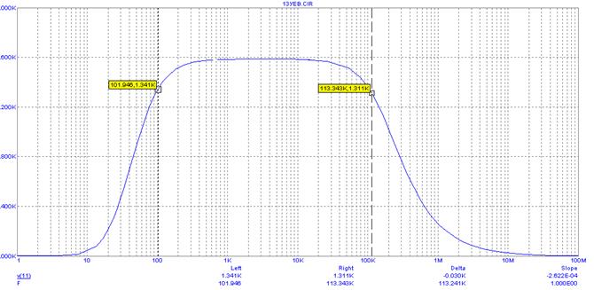 Пояснительная записка После проверки расчета компьютерным моделированием с использование программы Micro-Cap 8.0 наблюдалось не выполнение технического задания. Для соблюдения требования технического задания выполним коррекцию схемы: коэффициент усиления по напряжению первого каскада оказался недостаточным, для повышения коэффициента усиления изменили сопротивления резистора После коррекции схемы получили следующие характеристики:
