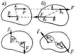 - Как определяется направление равнодействующей системы сходящихся сил при построении силового многоугольника? - Каковы условия и каковы уравнения равновесия системы сходящихся сил, расположенных в пространстве и плоскости? - Возможно ли равновесие трех сходящихся сил, не лежащих в одной плоскости? - Обязательно ли будет находиться в равновесии тело, если на него в одной плоскости действуют три силы и линии их действия пересекаются в одной точке? - Что называется равнодействующей системы сил? - Как сложить силы: а) геометрически, б) аналитически? - Как разложить силу по двум заданным направлениям? - Что называется моментом силы относительно центра на плоскости? - Какая система сил называется парой? - Можно ли заменить действие пары сил на тело одной силой? - Что такое момент пары? - Какая плоскость называется плоскостью действия пары? - Какие пары называются эквивалентными? - Что называется плечом пары? - Запишите векторную и скалярную зависимости между элементами пары. - Почему пара сил не имеет равнодействующей? - Имеет ли пара сил равнодействующую? - Каким образом можно уравновесить действие на тело пары сил? - Что такое момент пары сил? - Изменятся ли моменты пар сил, если положения сил, показанные на рис. а, изменить на положения, показанные на рис. б?