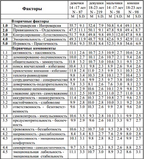 (М - среднеарифметическое, S. D. - стандартное отклонение) Опросник, состоит из 75-и противоположных по значению высказываний, каждое из которых выявляет важные свойства личности и особенности поведения человека в некоторых жизненных ситуациях. В данном опроснике нет утверждений правильных или неправильных, так же как нет “хороших” или “плохих” черт личности, поэтому следует оценить все 75 высказываний. Все стимульные фразы разделены оценочной шкалой. Прочтите внимательно высказывание под номером 1 и определите, какая его часть больше соответствует особенностям Вашей личности. Если Вы считаете, что левая, то используйте для оценки символы -2 и -1 шкалы, если Вы считаете, что правая, то используйте правую часть шкалы (2 и 1 без знака -). Цифрами Вы отразите степень выраженности оцениваемого признака: 2 - сильно выражено, 1 - слабо выражено, если Вы сомневаетесь в выборе, то пишите 0. Все оценки выставляйте в строчку, группируя их в пять столбиков. Если используется бланк ответов, то оценки заносятся в левую ячейку бланка ответов. После того, как все утверждения оценены их необходимо перевести в баллы. Для этого первичные сырые оценки -2-1 0 1 2 заменяются соответствующими баллами 5 4 3 2 1. Переводные баллы заносятся в правую ячейку бланка ответов, которые в дальнейшем суммируются по вертикали, и, таким образом, получаются тестовые параметры личности. Каждый первичный компонент - фактор состоит из суммы трех балльных оценок. Например, фактор 1.1 активность - пассивность, это сумма баллов, полученная на стимулы 1, 6 и 11. Вторичный фактор - это сумма пяти первичных факторов. Для того, чтобы получить факторы необходимо суммировать по вертикали переведенные в баллы стимульные оценки. Полученные, таким образом, тридцать факторов (пять вторичных и двадцать пять первичных) в дальнейшем будут использоваться для интерпретации результатов тестирования.