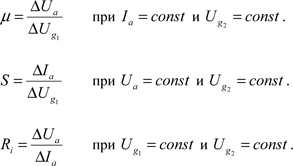 Крутизна и внутреннее сопротивление являются функциями от анодного напряжения и температуры катода. Если температура катода постоянна, то в пределах участка «трех вторых» крутизна равна первой производной от функции «трех-вторых». 5) Триод — трехэлектродный прибор, состоящий из катода, анода и управляющей сетки, является простейшей усилительной лампой. Устройства: Трех электродная электронная лампа — триод отличается от диода наличием третьего электрода — управляющей сетки. Назначение сетки В большинстве современных ламп этот элёктрод выполняется в виде проволочной спирали из вольфрама, никеля, молибдена или их сплавов. Сетка располагается вблизи катода (рис. 14-1) в пространстве между анодом и катодом. Витки сетки укрепляются при помощи держателей. Катоды, так же как у диодов, применяются прямого накала, или подогревные. Устройство триодов и их условные обозначения на схемах даны на рис. 14-2. Свойство сетки управлять анодным током триода позволило применить их для создания электронных усилителей, электронных генераторов, реле и т. д. Параметрами триода называются постоянные величины, устанавливающие связь между изменением анодного тока и изменениями напряжения на аноде и на сетке, т. е. величины, характеризующие основные свойства лампы. Основными параметрами триода являются: крутизна характеристики S, внутреннее сопротивление при переменном токе Крутизной анодно-сеточной характеристики триода или просто крутизной называется отношение приращения анодного тока