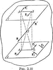 Теорема 2. Две пары, имеющие равные моменты, эквивалентны. Пусть на тело в плоскости I действует пара (F1,F`1) с моментом M1. Покажем, что эту пару можно заменить другой парой (F2, F`2), расположенной в плоскости II, если только ее момент М2 равен М1. Заметим, что плоскости I и II должны быть параллельны, в частности, они могут совпадать. Действительно, из параллельности моментов M1, и М2 следует, что плоскости действия пар, перпендикулярные моментам, также параллельны. Введем в рассмотрение новую пару (F3, F`3) и приложим ее вместе с парой (F2, F`2) к телу, расположив обе пары в плоскости II. Для этого согласно аксиоме 2 нужно подобрать пару (F3, F`3) с моментом М3 так, чтобы приложенная система сил (F2, F`2, F3, F`3) была уравновешена. Положим F3=–F`1 и F`3=–F1 и совместим точки приложения этих сил с проекциями А1 и B1 точек А и В на плоскость II (см. рис. 3.10). В соответствии с построением будем иметь: М3=–M1 или, учитывая, что М1=М2, М2+М3 = 0, получим (F2, F`2, F3, F`3)~0. Т.о., пары (F2, F`2) и (F3, F`3) взаимно уравновешены и присоединение их к телу не нарушает его состояния (аксиома 2), так что (F1, F`1)~(F1, F`1, F2, F`2, F3, F`3). (3.16). С другой стороны, силы F1 и F3, а также F`1 и F`3 можно сложить по правилу сложения параллельных сил, направленных в одну сторону. Они равны по модулю, поэтому их равнодействующие R и R' должны быть приложены в точке пересечения диагоналей прямоугольника ABB1A1, кроме того, они равны по модулю и направлены в противоположные стороны. Это означает, что они составляют систему, эквивалентную нулю. Итак, (F1, F`1, F3, F`3)~(R, R')~0. Теперь можем записать (F1, F`1, F2, F`2, F3,F`3)~(F2, F`2).(3.17). Сравнивая соотношения (3.16) и (3.17), получим (F1, F`1)~(F2, F`2), ч.т.д. Из этой теоремы следует, что пару сил можно перемещать и поворачивать в плоскости ее действия, переносить в параллельную плоскость; в паре можно менять одновременно силы и плечо, сохраняя лишь направление вращения пары и модуль ее момента (F1h1=F2h2).