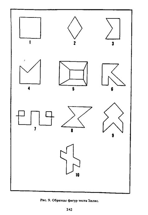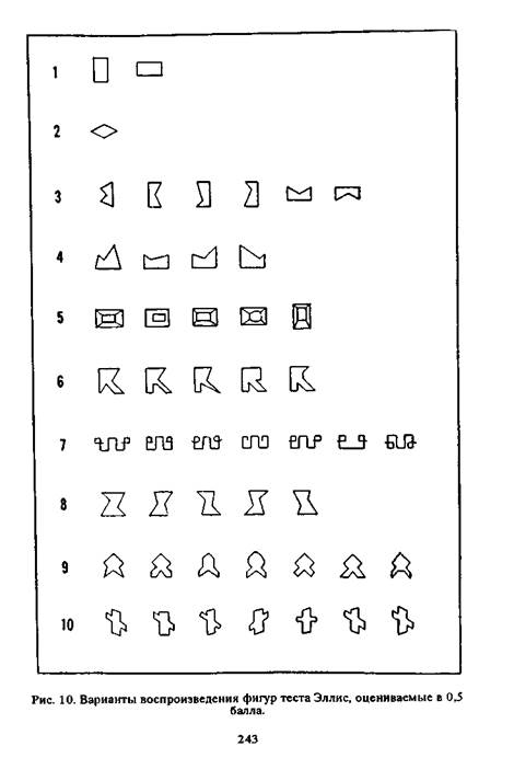 3. Для детей старше 8 лет целесообразно использовать на- бор 10 фигур из графического теста Эллис (рис. 9). Фигуры воспроизводятся ребенком по памяти. В зависимости от сте- пени погрешностей при воспроизведении фигур каждая оце- нивается в 1, 0,5 или 0 баллов. (рис. 10). Затем оценки сум- мируются. Причинами снижения результатов в данном зада- нии могут быть как диспраксия, конструктивная апраксия, так и зрительная агнозия. Для дифференциации расстройств зри- тельного гнозиса от диспраксий следует результаты выполне- ния данного задания сопоставить с результатами, полученны- ми в палочковом тесте Гольдштейн-Ширера, менее чувстви- тельном к нарушениям пальцевого праксиса. Графический тест Эллис является диагностически довольно чувствительным к резидуально-органическим энцефалопатиям у детей.