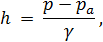 Открытый пьезометр Открытый пьезометр – это прозрачная трубка небольшого диаметра, один конец которой открыт и сообщается с атмосферой, а второй конец присоединён к точке сосуда с капельной жидкостью, в которой измеряется избыточное давление. Пьезометрическая высота Высота столба жидкости в открытом пьезометре, который своим весом способен создать давление, равное избыточному давлению в рассматриваемой точке. Обозначают пьезометрическую высоту h, а находят как где p – абсолютное гидростатическое давление в точке; pa – атмосферное давление;