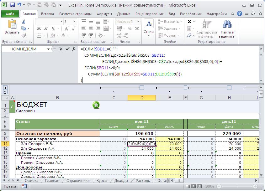 Очевидно, что второй вариант более понятен по смыслу выполняемых расчетов. При вводе многострочных выражений используется сочетание клавиш Alt+Enter для принудительного переноса строки. Также в качестве разделителя внутри выражений можно использовать разное количество пробелов на разных уровнях скобок – этот прием также немного облегчает восприятие сложных выражений. Но слишком усердствовать с многострочными выражениями тоже не стоит – формулы Excel все-таки отличаются по возможностям от языка программирования. В противном случае легко добиться того, что размер области редактора формул перекроет большую часть рабочего листа электронной таблицы, что вряд ли приведет к облегчению восприятия самой формулы. В идеале для лучшего восприятия формула примера должна выглядеть так: =ЕСЛИ($BD11=0; ""; СУММ( ЕСЛИ(Доходы!$I$6:$I$503=$BD11; ЕСЛИ(Доходы!$H$6:$H$503=C$7; Доходы!$K$6:$K$503; ); ) ) + ЕСЛИ($BG110; 0; СУММ( ЕСЛИ($BF12:$BF$59=$BD11; D12:D$59; ) ) ) )