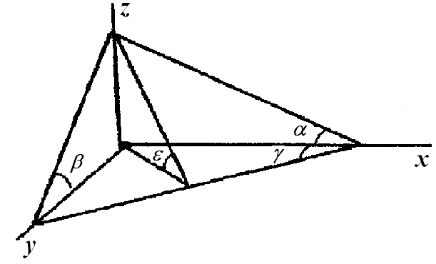 Рис.1.3. Трехгранный клин как элемент отвала: α - угол крошения, β - угол оборота пласта, ε - угол постановки поверхности к дну борозды
