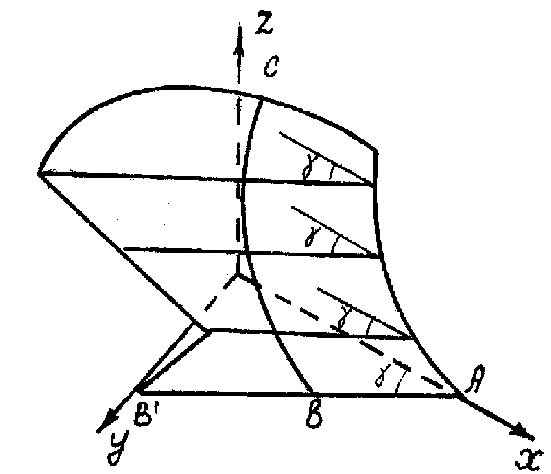 У цилиндроидальной поверхности угол наклона горизонтальных образующих к стенке борозды γ при перемещении по направляющей кривой ВС непрерывно изменяется. За счет увеличения угла верхних образующих создается подгиб крыла, способствующий улучшению оборачивающей способности корпуса плуга (рис.1.10б).