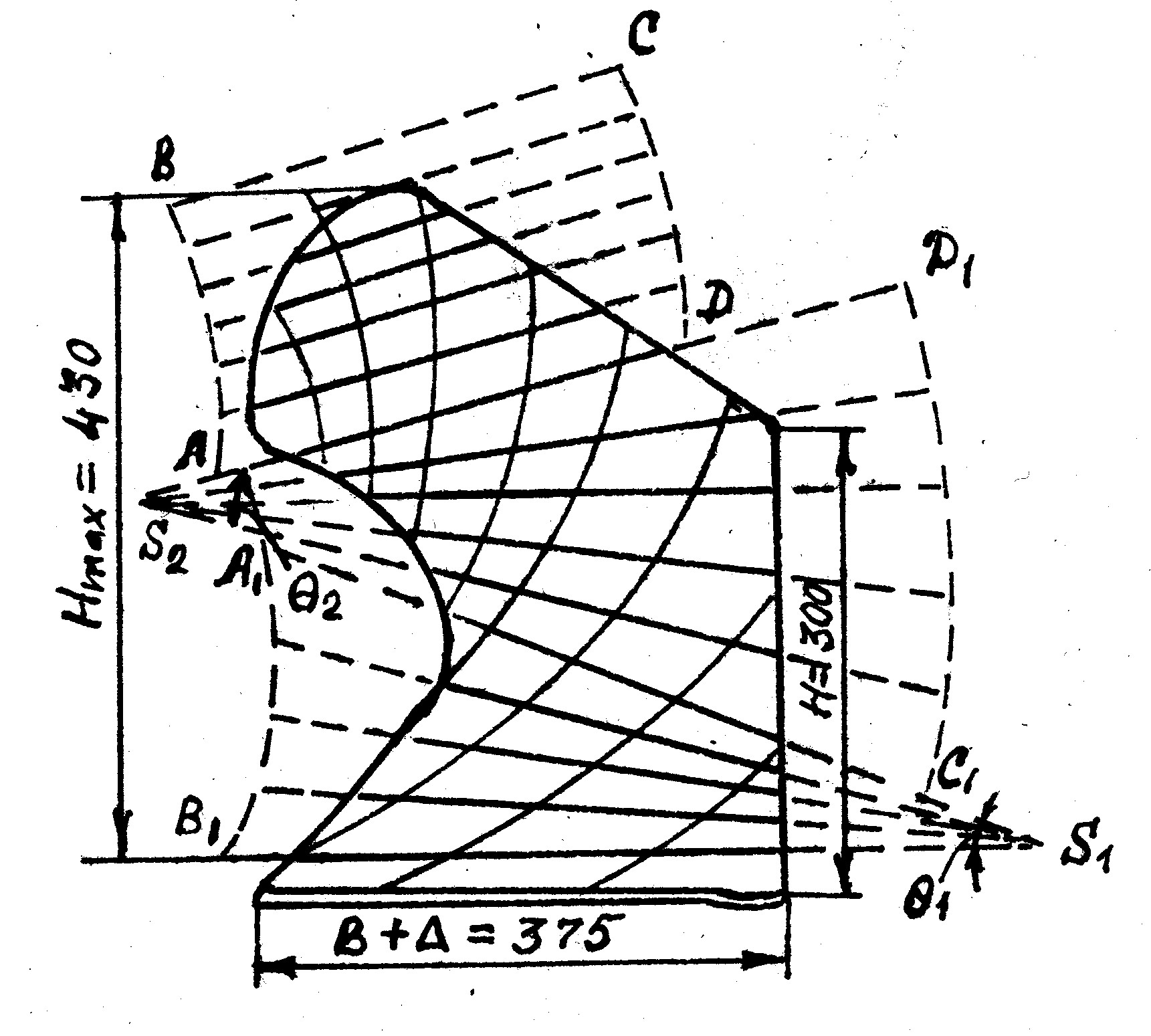 Рис.1.13. Корпус скоростного плуга с развертывающейся поверхностью: S1B1A1 - нижний конус; S1Д1С1 - верхний конус; АВСД - цилиндр верхней части отвала