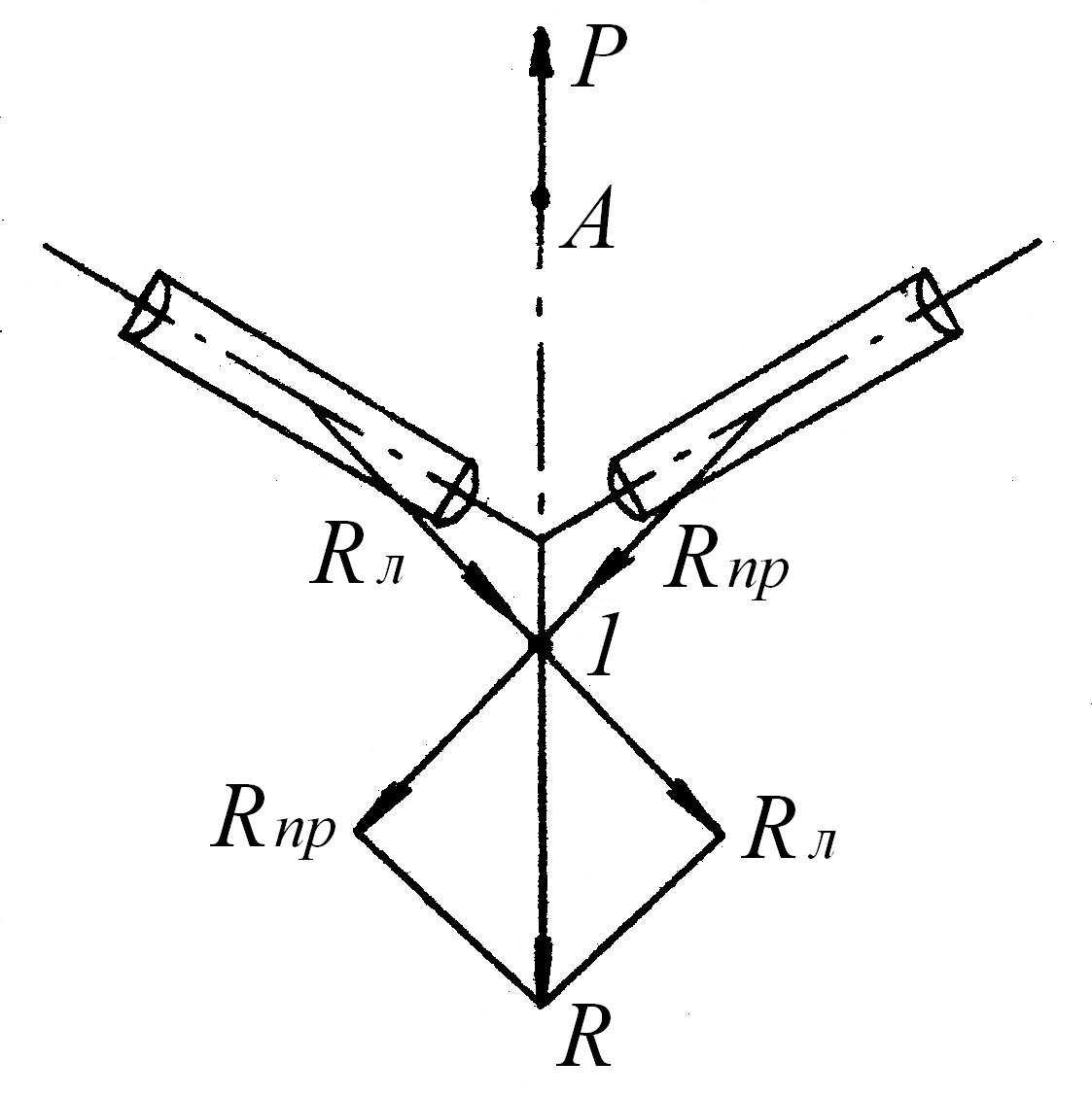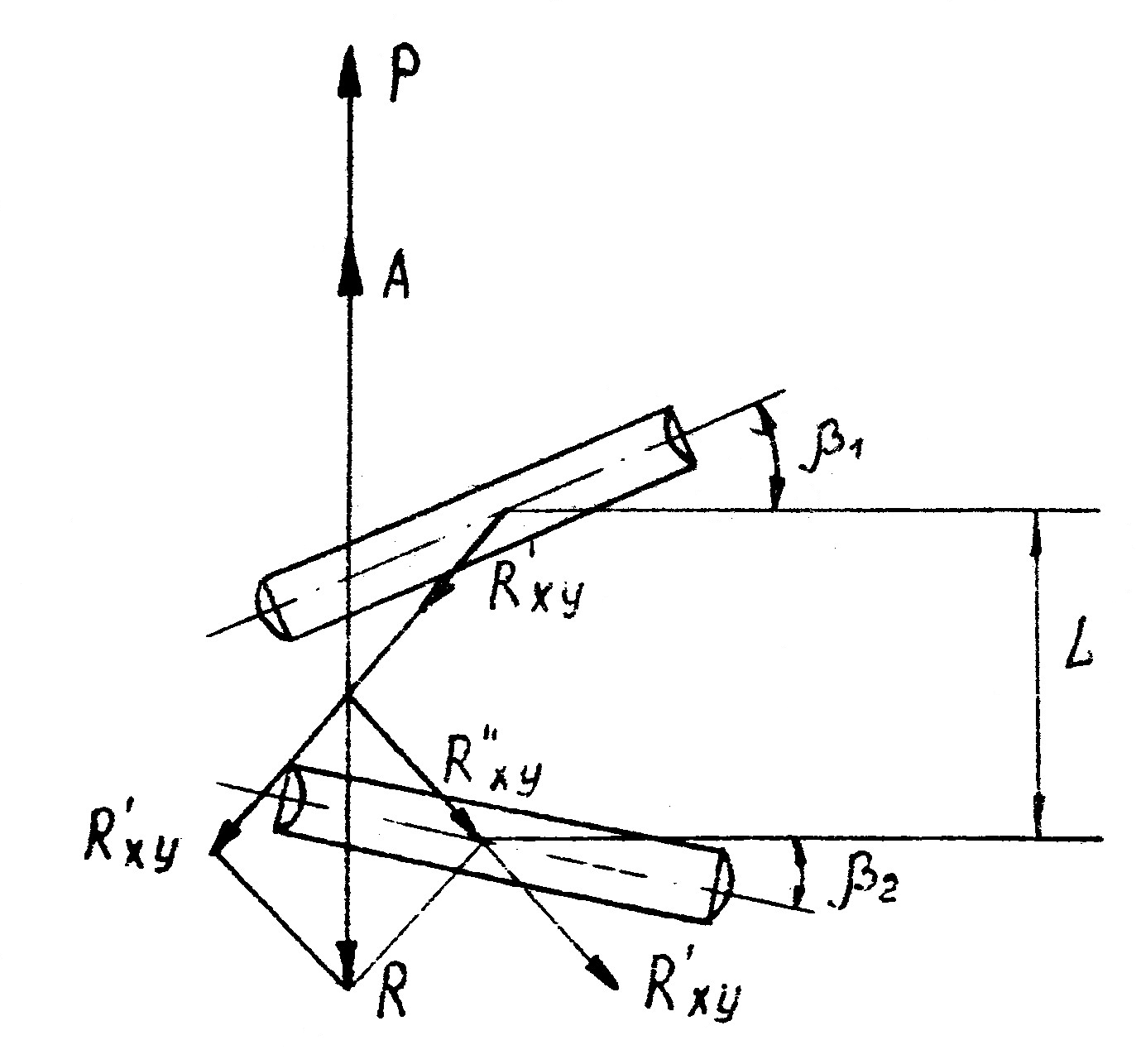 Симметричное размещение дисков относительно продольной оси машин типично полевых борон и лущильников (рис.6.8). При одинаковом погружении дисков и однородной почве равнодействующие левой Rл и правой Rпр батарей дисков равны по величине, а точка их пересечения l лежит на продольной оси лущильника. Направление равнодействующей проходит через точку прицепа А, поэтому лущильник будет двигаться прямолинейно. Непостоянство свойств может вызвать изменение величины и направления усилий Rл и Rпр. Это приведет к зигзагообразному движению лущильника. Отчасти изменчивость Rл и Rпр можно компенсировать реакцией колес лущильника. Этому же способствует увеличение длины прицепа. Садовые бороны чаще всего изготавливают несимметричными, чтобы трактор мог двигаться дальше от крон деревьев. Устойчивость несимметричной машины, тем не менее, может быть достигнута, причем без использования полевых досок и бороздных колес. На рис. 6.9 видно, что равновесие обеспечивается за счет использования право- и левооборачивающих батарей. Существенное влияние на устойчивость оказывают углы атаки β1 и β2, расстояния между центрами батарей L. В частности, чем больше расстояние L, тем левее сдвигается точка пересечения сил R¢ху и R¢¢ху, а следовательно, и линия тяги трактора должна быть сдвинута влево.