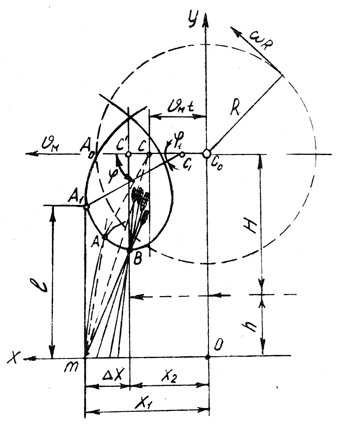 При работе жатки планка мотовила совершает сложное движение: переносное вместе с машиной по полю со скоростью VM и относительное с угловой частотой w. Если оси координат расположить так, как указано на рис. 3, и за исходное принять горизонтальное положение луча С0А0, то в произвольный момент центр мотовила переместится в точку С, а луч повернется на некоторый угол j. Проектируя точку А на оси координат, можно получить