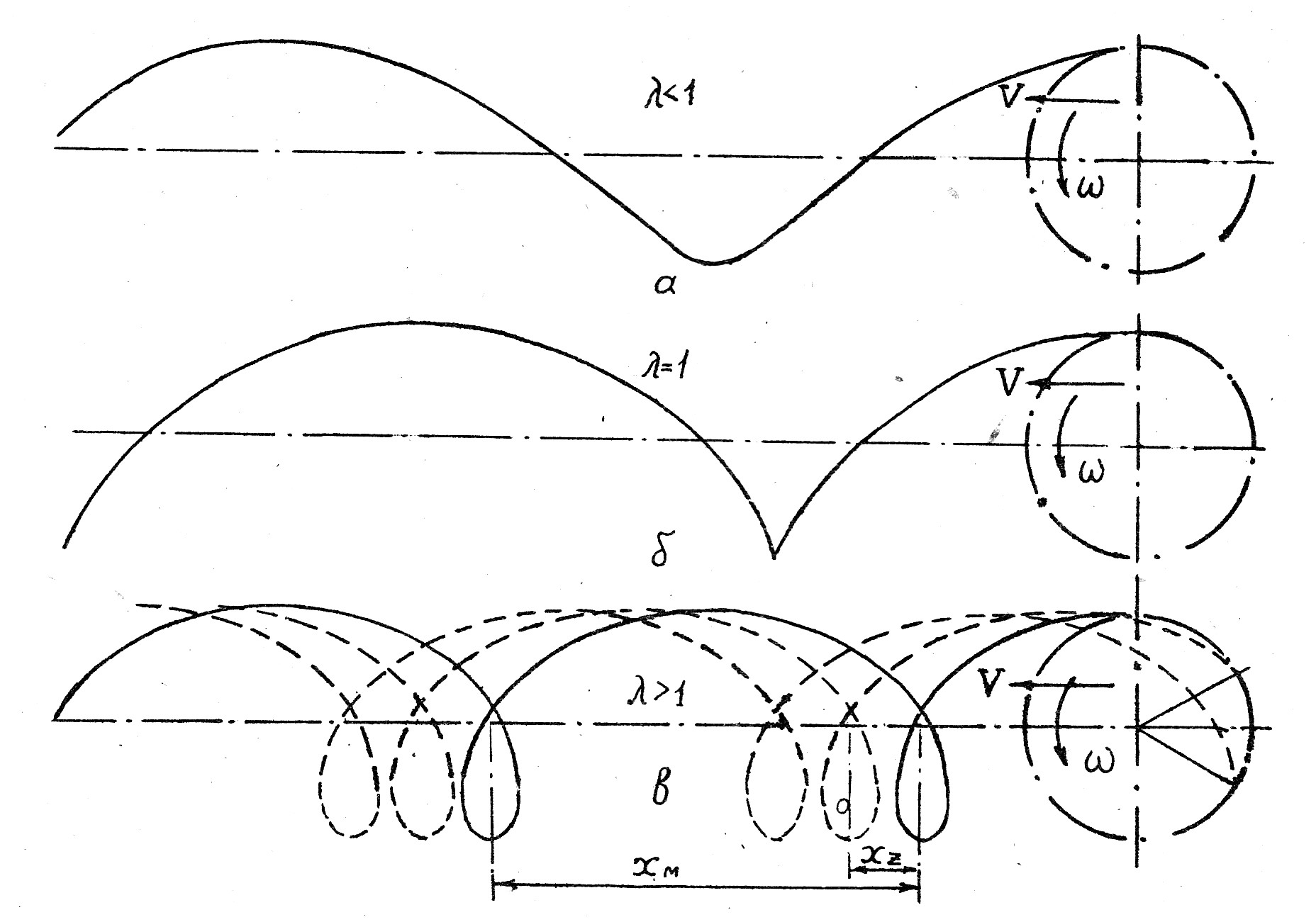 где H - высота установки вала мотовила над линией ножа; h - высота установки режущего аппарата. Траектория, описываемая параметрическими уравнениями (2), представляет собой циклоиду, форма которой зависит главным образом от соотношений l окружной wR и поступательной VM скорости планки (рис. 4).