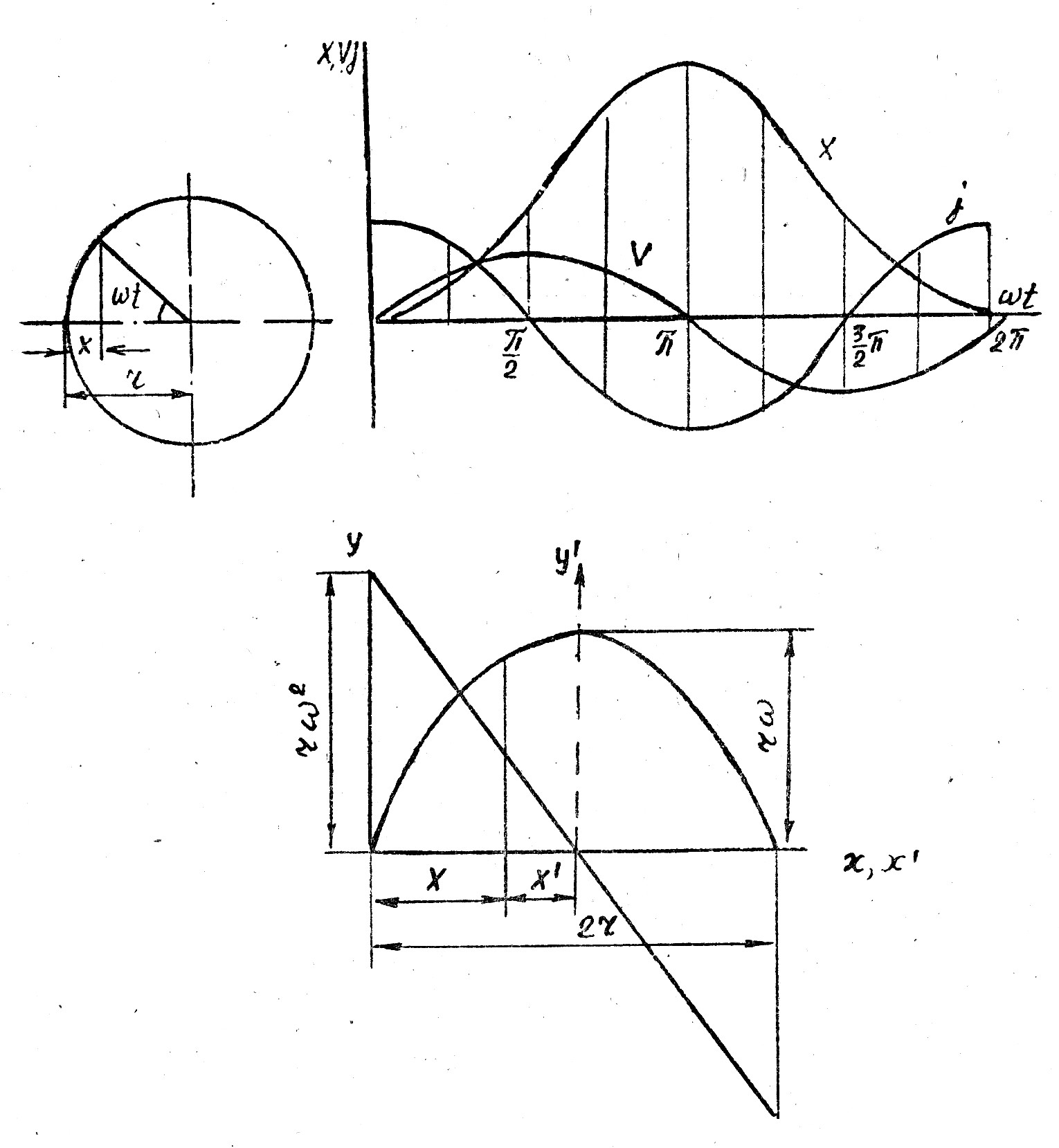 При малом значении отношения радиуса кривошипа r к длине шатуна l движение ножа может быть описано уравнениями гармонического колебания: