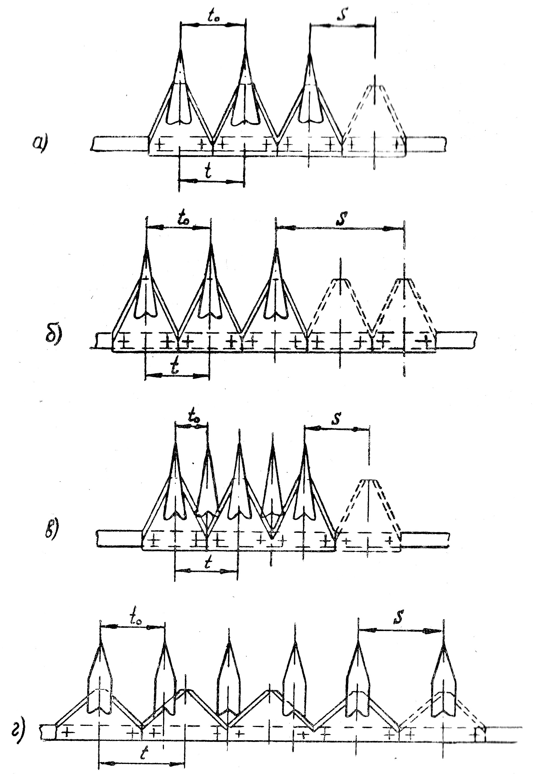 у2 = 2rх‑ х2; х2 + у2 = 2rх. Если центр координат графика y¢ = Vx/w перенести на расстояние r вправо от исходного положения ножа (точки А0), т. е. х' = r ‑ х, то (r - х')2 + (у¢)2 = 2r(r - х'); r2 – 2rх' + (х')2 + (у¢)2 = 2r2 – 2rх'; (х')2 + (у¢)2 = r2; иначе говоря, в новой системе координат получена окружность радиусом r. Построение такой окружности используют при графическом определении скорости ножа при любом перемещении, заданном величиной х или х' (рис. 4). Таким образом, скорость ножа в период резания является величиной переменной, изменяющейся в довольно широких пределах. Так как в основном стебли перерезаются сегментом у кромки пальцев, то скорость резания будет зависеть от шага размещения сегментов и пальцев, т. е. от типа анализируемого режущего аппарата. Известно, что в зависимости от соотношения шага режущей и противорежущей частей аппараты подразделяют на несколько типов (рис. 5). Прежде всего это аппараты нормального резания: однопробежные, где t = t0 = S (рис. 5а), двухпробежные, у которых S = 2t = 2t0, низкого резания, когда S = t = 2t0, и среднего резания, при S = t = 4t0/3. У аппарата нормального резания (однопробежного) скорость начала резания определится величиной хода ножа хн (рис. 6), когда нижняя рабочая точка лезвия А (перемещающаяся перед упорным отростком пальца) коснется противорежущей пластины в точке А1 На рис. 6а видно, что