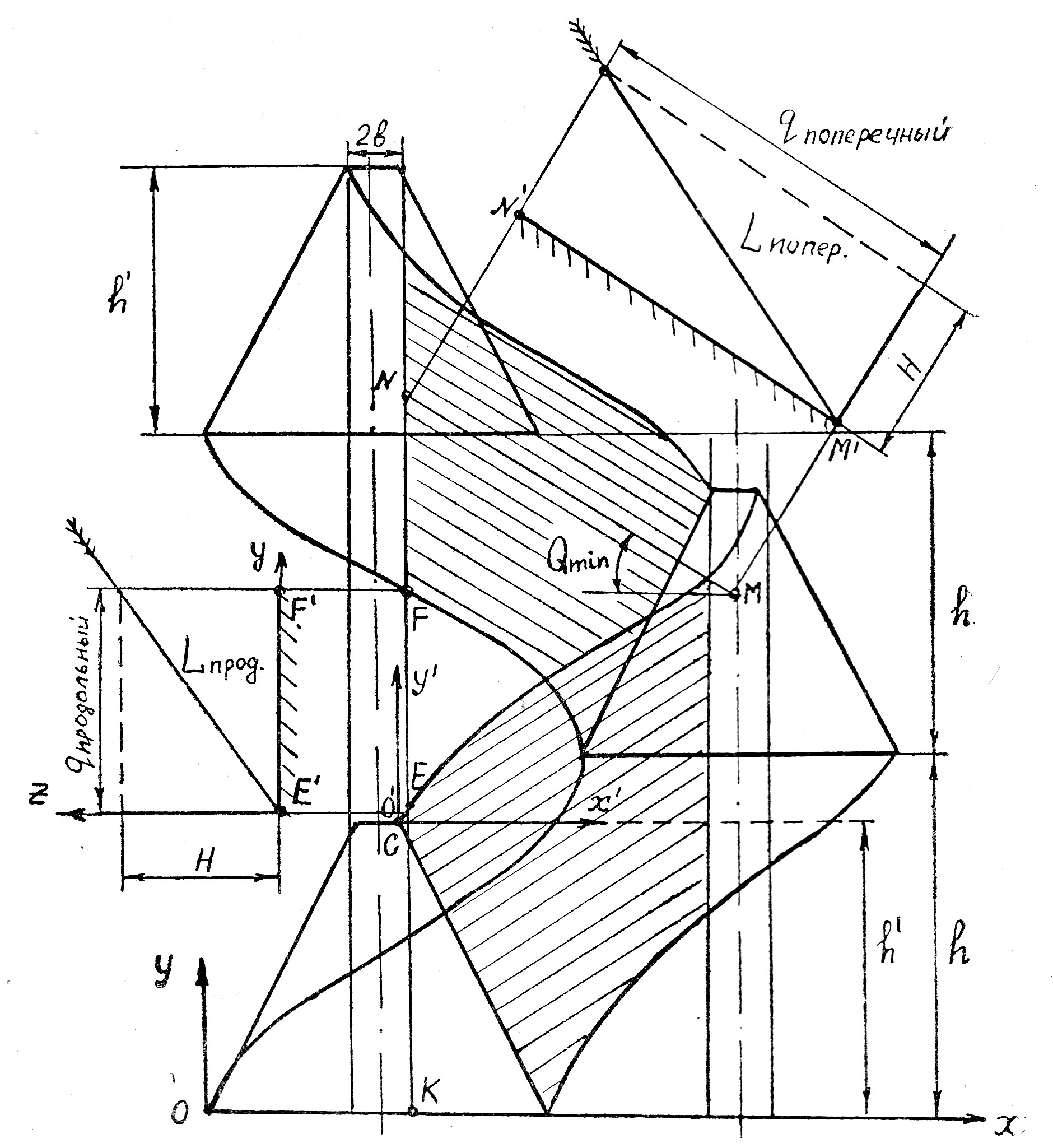 Следовательно, траектория любой точки ножа представляет собой косинусоиду. Если из характерных точек (вершины и основания) сегмента провести косинусоиды при прямом и обратном ходе ножа, то поверхность поля покроется площадками, по которым пробегают рабочие лезвия ножей. В сочетании с траекториями движения пальцев (а это ‑ прямые линии, отстоящие от оси пальцев на расстоянии b и параллельные оси у) эти площадки представляют собой диаграмму движения сегмента (рис. 8). Как видно из рис. 8, не вся поверхность поля пробегается лезвиями ножа. Незаштрихованный участок от точки Е до F не попадает в зону траекторий точек лезвия. Стебли, расположенные на этой площадке, будут отогнуты вперед противорежущим брусом и окажутся срезанными в точке F при обратном движении сегмента. Иначе говоря, стебли на участке от точки Е до F будут срезаны после продольного отгиба. Максимальная величина отгиба qпрод равна отрезку EF. Если учесть, что нож расположен на высоте Н от поверхности поля, то высота стерни Lпрод может быть определена по теореме Пифагора: