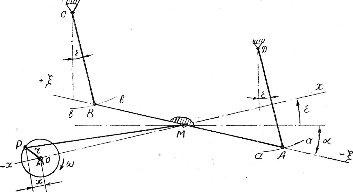 Грохот ‑ это рабочий орган, осуществляющий просеивание того или иного материала. Он состоит из рабочей поверхности АВ, подвесок и механизма привода (рис. 1). Решето АВ грохота является звеном четырехзвенного механизма АВСД. Подвески АД и ВС обычно располагают перпендикулярно направлению средней линии положения шатуна MP, приводимого в движение кривошипом ОР.