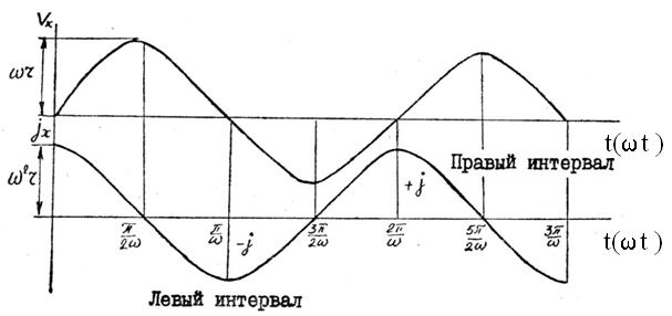 где x, Vx, jх - соответственно перемещение, скорость и ускорение решета; w, r ‑ частота вращения и радиус кривошипа. Положительным считают перемещение грохота вправо от точки О, отрицательным ‑ влево. Кривые изменения скорости и ускорения грохота представляют собой соответственно синусоиду и косинусоиду в функции времени t или угла поворота кривошипа wt (рис. 2). Ускорения грохота, от которых зависит характер перемещения вороха по решету, могут менять не только величину, но и направление (рис. 2). Участок, на котором ускорение отрицательно, называют обычно левым интервалом (от p/2w до Зp/2w), а область положительных ускорений. ограничена правым интервалом (от Зp/2w до 5p/2w).