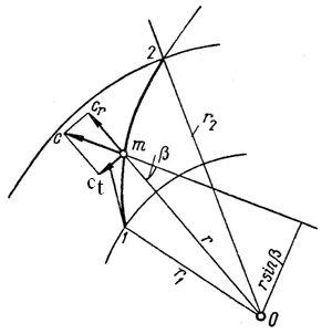 Количество движения некоторой массы воздуха т', переместившейся в течение одной секунды мимо точки т, определится величиной т'с, а момент количества движения относительно центра О — выражением М = m' cr×sin b. Разложим скорость с на составляющие: тангенциальную сt и радиальную сr. Тогда сt = с sinb и, следовательно, М = m¢сr×sinb, где Очевидно, подобным же образом момент М выразится для точек 1 и 2 входа и выхода, т. е. для входа М1 = т'r1ct1 а для выхода М2 = т'r2сt2. Разность DM = М2 — Мх — т'×(r2ct2 — r1ct1) представит изменение момента количества движения массы воздуха т'. Энергия, которую приобретет при этом воздух, определится произведением wDМ, так что