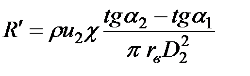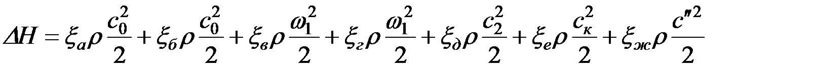 где с0, w1, с2, ски с¢¢ — соответственно скорость входа в вентилятор, относительная скорость при входе в колесо, абсолютная при выходе из колеса, в кожухе и в выходном канале; x а, x б, x в, x г, x д, x е, x ж — коэффициенты потерь соответственно во входном отверстии, при повороте потока, на удар при входе в колесо, при протекании потока между лопатками, на выходе из колеса, на трение в кожухе и при выходе потока к выходному сечению. Уравнение действительной напорной линии, учитывающее влияние конечного числа лопастей, гидравлические потери и потери на удар, имеет следующий вид: