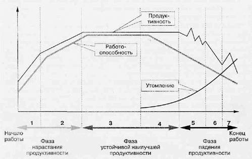 1 — период экстренного врабатывания; 2 — период тонкого врабатывания; 3 -— период оптимальной работоспособности; 4 — период полной компенсации утомления; 5 — период неустойчивой компенсации утомления; 6 — период прогрессивного снижения продуктивности; 7 — «конечный прорыв» Рис. 1.19. Динамика продуктивности деятельности и работоспособности организма при непрерывной длительной работе Период оптимальной работоспособности характеризуется высокой и устойчивой производительностью труда, положительными эмоциями. В период полной компенсации наблюдаются первые признаки усталости, необходимости в отдельные моменты более тщательного сосредоточения внимания на выполняемых действиях и операциях, однако эффективность деятельности остается на уровне нормативных требований. Соотношение периодов и их общее Глава 5. Психологическое обеспечение боевого дежурства (боевой службы).., ________ ]2Ъ время зависят от многих факторов: от запаса энергетических ресурсов, то есть выносливости, воинского мастерства, состояния здоровья, режима питания, сложности решаемых задач, слаженности расчета и т. д. Данная фаза занимает основную часть рабочего цикла (не менее 50% рабочего времени). Фаза падения продуктивности характеризуется действием достаточно сильного нарастания утомления. Военнослужащий уже не может компенсировать утомление полностью. Данная фаза состоит из нескольких периодов. В период неустойчивой компенсации (5) начинают сказываться последствия утомления, волевым усилием уже не удается поддерживать высокий уровень производительности труда, точно и своевременно реагировать на изменение обстановки. Все ярче проявляются признаки утомления и чувство усталости. В период прогрессивного снижения эффективности деятельности (6) происходят значительные сдвиги в функциональном состоянии организма. Утомление быстро нарастает, увеличивается количество ошибок, таких как нарушение последовательности работы, пропуск операции или действия, неправильные решения, сбой в действиях и т. п. Период конечного порыва (7) может наблюдаться за 20-30 минут до конца несения службы и выражаться в повышении эффективности боевой деятельности. Такое повышение дееспособности связано с улучшением настроения военнослужащего в преддверии окончания боевого дежурства, службы в карауле, с мобилизацией оставшихся энергетических ресурсов. С учетом приведенной динамики должны планироваться профилактические мероприятия по предупреждению негативных состояний и срывов в деятельности. Кратко остановимся на их основном содержании. 1. Планирование и организация эргономических условий, способствующих сохранению оптимального уровня работоспособности личного состава (освещенность, цвет, температурный режим, оборудование рабочего места оператора, устранение лишнего шума и т. п.). Установлено, в частности, что красный, оранжевый цвета возбуждающе действуют на эмоциональную сферу человека, повышают артериальное давление, усиливают мускульное напряжение, увеличивают частоту дыхания и пульс. Зеленый, голубой, синий и фиолетовый цвета, напротив, действуют успокаивающе [76, 91]. 2. Организация оптимального режима труда и отдыха в процессе несения службы. Например, в ходе боевого дежурства зачастую наблюдается очень слабая нагрузка на определенные группы мышц. Регулярная