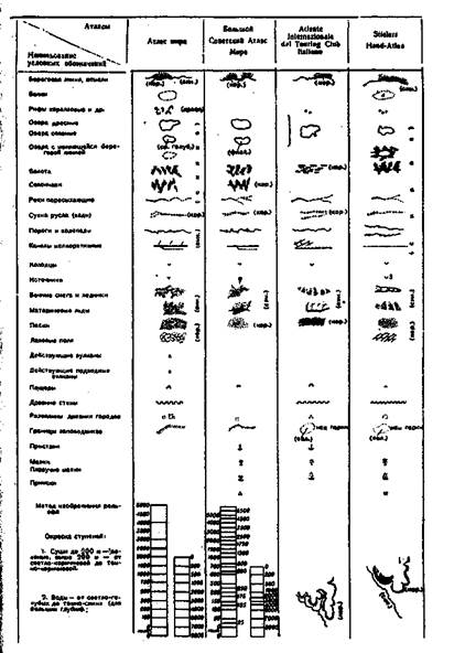 ♦ центральным вопросом составления карт атласов служит определение оптимальной нагрузки карт различными элементами без потери читаемости. В ЦНИИГАиК выполнены соответствующие экспериментальные работы нафузки атласны* карт по сравнению с топографическими картами (дл# СССР — по сравнению с картой 1:300 000, для других стран --с картами близких к этому масштабов). Установлены средние «классические» положения: на картах атласов присутствую^ все крупные реки, около 30% рек средней величины, около 10% мелких рек; все города, а сельские поселения имею? разное представительство в зависимости от их местной значимости — от 30 до 2%; дороги играют связующую роль между главными населенными пунктами; ♦ характер генерализации отдельных элементов целесообразно выражать в количественной форме. Для этого устанавливаются нормы отбора отдельных элементов — количество населенны* пунктов на см2, отбор рек в см в масштабе карты и т.д. Получс ны нормы отбора для населенных пунктов от 1 н.п./см2 Д° 3,6 н.п./см2, для рек — от 0,5 до 1,5 см в масштабе карты. Он*1 до сих пор остаются регламентирующими при создании об' щегеографических атласов; ♦ подписи географических объектов затеняют смысловое со' держание карт. Анализ всемирных атласов показал преимУ щество использования малых по высоте и очень тонких $° рисунку шрифтов; ♦ во всемирных атласах используют в качестве условных зн#' ков топографические условные знаки стран-издателей. Рас хождения в основном в размерах условных знаков. Наибол^е существенны они при изображении населенных пунктов: час?ь атласов используют контурные условные знаки и пунсоне' но большинство — только пунсоны. Передача качественна* и количественных признаков осуществляется разными пр**' емами: размером и рисунком пунсона, размером и рисунков шрифта названия населенного пункта, подчеркиванием ра3' ного рода. Унификации нет, и атласы сложно сопоставлят^' ♦ в большинстве случаев для изображения рельефа использУ ют систему горизонталей с послойной окраской, в иноС*"' ранных атласах нередко используется художественная штр**~ ховка крутых форм рельефа; ♦ анализ всемирных атласов позволил установить параметра
