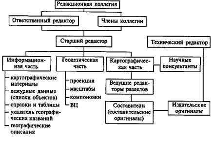♦ характер печати. При полиграфическом способе — характеристика бумаги, количество печатных листов, односторонняя или двухсторонняя печать, среднее количество красок. При компьютерном воспроизводстве — соответствующие технические данные; ♦ размещение текста (в начале или конце соответствующих разделов, или — целиком — в конце атласа, или — в отдельном приложении и т.д.). Подытоживает работу этапа проектирования атласа создание его макета. Макет атласа передает его общий вид. Макет готовится в натуральную величину с размещением титульных листов, вводного текста, полных наборов компоновок страниц разделов (и каждой карты), размещением текста и приложения. Обычно он комплектуется из типовых компоновок с названием карт. При подготовке макета атласа окончательно уточняется перечень карт и последовательность их размещения, названия разделов и отдельных карт, компоновки и масштаб каждой карты, размещение карт-врезок и внешнее оформление атласа в целом. Искусство подготовки макета атласа состоит в том, чтобы, не нарушая установленной последовательности размещения карт в атласе, максимально использовать возможности формата атласа. Схема организации создания атласов Программа и макет атласа рассматриваются и утверждаются Редакционной коллегией. В дальнейшем они являются документами, обязательными для исполнения при проведении этапа составительских работ. На этапе проектирования атласов рассматривается и закрепляется организационно весь последующий процесс работы над произведением. Сложность работы видна, например, из принципиальной схемы организации создания общегеографического атласа [5]. Несмотря на достаточную определенность содержания Программы атласов, унифицированных правил ее написания нет. В качестве иллюстрации приводим краткое содержание трех программ. Программа Атласа Офицера [5] I. Общие положения (назначение атласа, виды работ с ним; общее содержание; современность произведения). II. Структура и компоновка атласа. Математическая основа карт (издание в 2-х томах: атлас и приложение; формат и объем атласа; общий принцип размещения карт по разделам; выбор масштабов и проекций; типовые компоновки листов). III. Содержание атласа (список карт по разделам; описание содержания карт одного территориального охвата и масштаба; взаимосвязь между содержанием общегеографических карт; тематика специальных карт; раздел военно-исторических карт; объем и содержание текстового приложения; особенности подачи информационного материала в таблицах, графиках, описаниях). IV. Картографические источники, условные обозначения, технология работ (перечень и анализ картографических, литературных и иных источников; требования к построению системы условных знаков общегеографических карт, карт специального содержания и военно-исторических; технологические требования к графическому и цветовому виду карт атласа, особенности двухсторонней печати). V. Организационные вопросы (назначение редакционной коллегии и разработка Положений о ее функциях; организация сквозного редакционного и технического руководства составлением, подготовкой к изданию и изданием карт атласа).