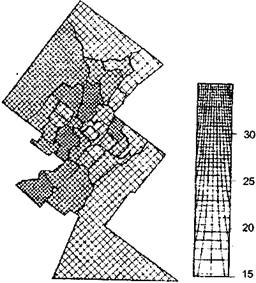 Рис. 4.20. Безынтервальная шкала. шает наглядность изображения, однако определять на глаз плотность штриховки в каждой территориальной ячейке и сопоставлять ее с легендой довольно затруднительно. Цветовые шкалы определяют цвет и оттенки красок, используемых на карте для послойной -окраски изолиний, для количественного фона и картограмм. При передаче нарастающих количественных признаков применяют шкалы возрастающей насыщенности цвета. При изображении рельефа для окраски ступеней высот используют особые цветовые гипсометрические шкалы, наилучшим образом приспособленные для передачи высоты и морфологии рельефа суши и морского дна.