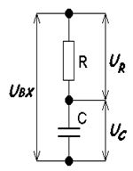 Чтобы определить, как изменяется во времени напряжение на выходе RC-цепи при действии на ее входе импульса напряжения прямоугольной формы длительностью tи и амплитудой Um, необходимо воспользоваться вторым законом Кирхгофа Uвх(t) = Uс(t) + UR(t), первым законом коммутации i(t)=C du c (t)/dt и формулой Ома I=U/R. Рисунок 1 – RC-цепь первого порядка
