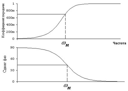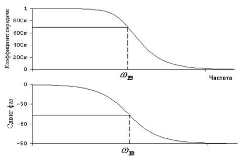 Из частотных характеристик цепи, приведенных на рисунке 2, видно, что рассмотренная цепь передает без изменения сигналы нижних частот, а на верхних частотах создает затухание выходного сигнала и его задержку по фазе, то есть, является фильтром нижних частот. Его граничная частота называется верхней граничной частотой wв.