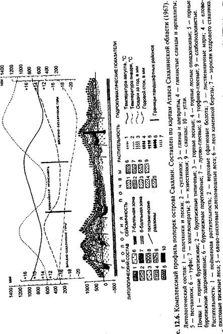 Описания по картам Описание — традиционный и общеизвестный прием анализа карт. Его цель — выявить изучаемые явления, особенности их размещения и взаимосвязи. Научное описание, составляемое по картам, должно быть логичным, упорядоченным и последовательным. Оно отличается отбором и систематизацией фактов, введением элементов сравнения и аналогий. В описание часто вводят количественные показатели и оценки, включают таблицы и графики. В заключении формулируются выводы и рекомендации. Описания могут быть общими комплексными (таковы, например, общегеографические описания) или поэлементными (скажем, описание только карстового рельефа). В настоящее время, когда для анализа карт широко привлекаются математические методы и компьютерные технологии, описания не утратили своего значения. Выполняя качественный анализ явлений и их взаимосвязей, опытный исследователь способен порой прийти к выводам более глубоким, чем если бы он следовал формальным алгоритмам и раскладывал исследование на элементарные логико-математические операции. Описания, основанные, главным образом, на визуальном анализе карт, хороши тем, что позволяют составить образное и целостное представление об изучаемом объекте и сделать выводы синтетического характера, применяя для этого неформальные эвристические подходы. Графические приемы включают построение по картам всевозможных профилей, разрезов, графиков, диаграмм, блок-диаграмм и иных двух- и трехмерных графических моделей. Многообразие графических построений можно систематизировать следующим образом: ♦ Р = / (х) или Р = / (у) — профиль по заданному на карте ♦ Р =/(г) — вертикальный разрез, для построения которого ♦ Р =/(() — временной разрез, создаваемый по серии разно ♦ Р ~/{х, у) — само картографическое изображение (проекция на горизонтальную плоскость); ♦ Р =/(х, г) или Р =/(у, I) — фронтальное изображение, т.е. проекция объекта на вертикальную плоскость; ♦ Р =/(х, /), или Р —/{у, 1), или Р =/(г, I) — метахронный (разновременный) разрез, для создания которого используются серии разновременных или разноуровневых (разновы-сотных) карт; ♦ Р =/(х, у, г) — блок-диаграмма или объемный; трехмерный рисунок объекта, на котором изображение поверхности совмещено с вертикальными разрезами; ♦ Р =/(х, у, I), или Р =/(х, г, (), или Р =/(у, г, () — метахронная блок-диаграмма, построенная по сериям разновременных и разноуровневых карт, причем одна из осей блок-диаграммы показывает изменение состояния: объекта во времени. Для анализа серий карт разной тематики удобны комплексные профили, на которых совмещаются, например, гипсометрический профиль, геологический разрез, почвенно-растительный покров, графики гидроклиматических показателей и т.п. На рис. 12.6 приведен такой профиль, на нем совмещены данные, снятые с девяти карт Атласа Сахалинской области. Аналогичным путем можно построить и комплексные социально-экономические разрезы, совместив по избранному направлению графики плотности населения, гистограммы его возрастного состава, занятости, кривые энергообеспеченности территории, распаханности земель и т.п. Подобные построения нужны для наглядного представления связей между явлениями и районирования территории по комплексу показателей. В географических исследованиях часто используют розы-диаграммы, наглядно передающие преобладающую ориент