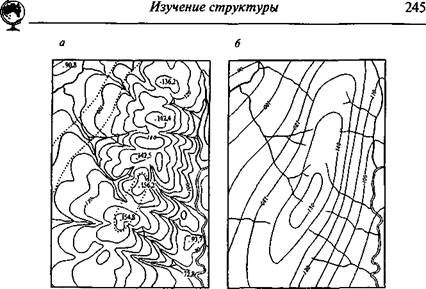 Рис. 13.5. Карта осадков теплого периода (в мм) на территории Республики Коми (а) и карты фоновой (б) и остаточной (в) поверхностей, полученные в результате аппроксимации уравнением 1-го проядка. Аналогичный эффект разложения на составляющие достигается и при расчете аппроксимирующей поверхности и отклонений от нее фактической исходной поверхности. При этом предполагается, что фоновая составляющая описывается некоторой неслучайной функцией /(х, у), а неучтенные отклонения от нее е соответствуют остаточной поверхности. Иначе говоря, члены аппроксимирующего уравнения приравниваются к членам уравнения разложения на составляющие На рис. 13.5 представлена карта осадков теплого периода года на территории Республики Коми и результаты ее разложения на фоновую поверхность 1-го порядка и остаточную поверхность. Карта фоновой поверхности передает общее увеличение количества осадков в направлении на юго-восток, что может быть связано с трансформацией масс арктического воздуха по мере их продвижения в глубь материка. А карта остаточной поверхности показывает отклонения от этой закономерности, в частности резкое увеличение количества осадков на западных склонах Урала и в районе Тиманского кряжа. Углубленное изучение структуры явлений нередко требует преобразования картографического изображения, т.е. трансформирования его с целью создания производных карт и получения по ним новой информации. Различают несколько видов преобразования. Рис. 13.6. Схематизация. Преобразование карты современного рельефа в карту морфоизогипс: а — современный рельеф; б — восстановленный «первичный» рельеф; точечным пунктиром показано обобщение некоторых горизонталей. Вычленение, т.е. выделение на карте интересующих исследователя компонентов сложной геосистемы и снятие прочих деталей. Выделенные элементы предстают в наглядной и удобной для данного исследования форме, например в виде системы спрямленных элементов рельефа и гидрографии, как на рис. 13.2. Схематизация — устранение второстепенных деталей и представление картографического изображения в упрощенном виде. Так, при схематизации гипсометрического изображения и снятии деталей эрозионного расчленения проявляется основная первично-тектоническая структура рельефа (рис. 13.6). Детализация — преобразование, противоположное схематизации, оно имеет целью сделать изображение более подробным. Например, на топографической карте можно детализировать изображение эрозионной сети, проведя по изгибам горизонталей тальвеги временных водотоков. Континуализация — замена дискретного картографического изображения непрерывным, что обычно связано с введением понятия «географическое поле». Например, карту тектонических трещин преобразуют в псевдоизолинейную карту поля трещинова-