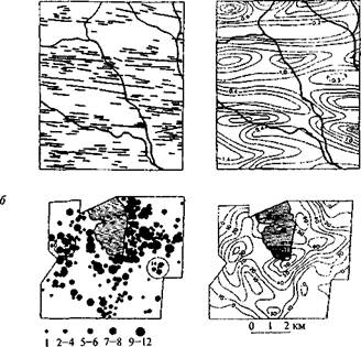 Рис. 13.7. Континуализация. а — преобразование карты трещин широтного простирания в карту поля трещиноватости (км/км2); б — преобразование карты размещения тетеревиных птиц в карту их плотности; значками показано число птиц, а на изоли-нейной карте — их плотность на 1 км2. тости (рис. 13.7), карту расселения — в карту плотности населения, карту размещения лесов — в карту лесистости и т.п. Такие преобразования дают представление об абстрактном рельефе явления, на производных картах хорошо читаются максимумы и минимумы распределения, их удобно коррелировать с другими изо-линейными картами. Дискретизация — обратное преобразование, имеющее целью перевод непрерывного изображения в дискретную форму. Хорошим примером может служить интерполирование по сетке точек при создании цифровых моделей по картам с изолиниями или картограммам. Средствами подобных преобразований часто служат графические операторы— сетки равномерно или неравномерно расположенных точек, геометрических ячеек, в каждой из которых выпол-
