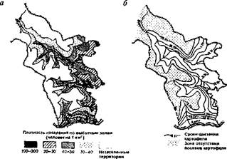 Рис. 13.9. Сходство картографических изображений при отсутствии причинной связи между явлениями (Южная Армения). а — плотность сельского населения; 6 — цветение картофеля.