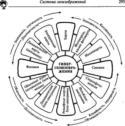 о геосистемах в целом. Имеется определенная весьма значительная аналогия между синтетическими картами и синтезированными снимками, когда два, три или более негативов одной и той же местности, каждый из которых получен в достаточно узкой зоне спектра, интегрируются с целью получения синтезированного цветного изображения. Подбирая светофильтры и комбинируя исходные негативы, исследователь вмешивается в процесс синтеза, меняет оттенки, повышает «вес» какой-либо составляющей, добиваясь четкого выделения интересующих его объектов, скажем, смешанных лесов, увлажненных ландшафтов или застроенных территорий. Существуют еще и комбинированные аналитико-синтетические и комплексно-синтетические изображения. Все фотокарты, космофотокарты, космофотогеологические и другие геоизображения, совмещающие фотографическое изображение местности со знаковыми обозначениями отдельных ее элементов, можно рассматривать как комплексные или комплексно-синтетические модели. Появление все новых и новых видов и типов геоизображений, их почти безграничное разнообразие позволяет в каждом конкретном случае выбирать оптимальные сочетания так, чтобы свойства разных пространственно-временных моделей дополняли друг друга. Множественность геоизображений обеспечивает всестороннее изучение сложных многомерных геосистем, выявление их структуры, иерархии, динамики. Анализ свойств геоизображений показывает, что между разными видами их часто нет резких границ, они как бы образуют единый ряд. Например, нет принципиальных различий между обычными и электронными картами, хотя на последних могут перемещаться знаки и изменяться цвета. А от электронных карт уже один шаг до анимаций. Точно так же существует плавный переход от карт и фотокарт к снимкам. При этом постепенно как бы ослабевают одни свойства и появляются другие. Например, при переходе от карт к снимкам нарастают свойства «копийности» или «сним-ковости». А при переходе от снимков к стереомоделям, фотоблок-диаграммам и потом к рельефным картам появляется трехмерность и объемность геоизображений.