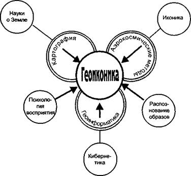 Рис. 17.1. Геоиконика в системе научных дисциплин. ет, соединяет эти дисциплины, сосредоточивая внимание на изучении общих свойств геоизображений. При этом геоиконика вбирает в себя элементы теории распознавания образов, опирается на достижения машинной графики, психологии восприятия и находится в тесном контакте с науками о Земле, планетах и смежными с ними социально-экономическими науками. В своем современном развитии геоиконика в самой сильной сте пени опирается на теорию географической картографии, т.е. на ту дисциплину, которая более всего продвинулась в теоретическом осмыслении геоизображений, их свойств, законов формирования, а главное, в практике их создания и использования. Геоиконика включает в круг своих интересов теоретические проблемы системного изучения пространственно-временных моделей, оценку их информативности, взаимной совместимости, общие принципы генерализации, законы восприятия и т.п. Много внимания уделяется методикам обработки и распознавания гео- изображений, приемам количественного анализа, технологиям цифрования, преобразования, повышения качества, хранения и воспроизведения их. В прикладном плане геоиконика развивает методы интерпретации и применения геоизображений в географии, геологии и геофизике, экологии и социально-экономических науках. Цели и задачи геоиконики таковы, что она выступает как некая надсистема, охватывающая картографию, аэрокосмическое зондирование и геоинформатику. Но диалектика развития и опора на географическую картографию постепенно ведут к тому, что геоиконика становится частью обновленной и интегрированной системы картографических дисциплин.