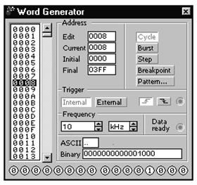 Генератор слов (кодовый генератор) предназначен для задания 16-разрядных двоичных слов. Двойным щелчком по условному обозначению прибора открывается его расширенное изображение. В левое вертикальное окно генератора можно записать 1024 слов, представляемых в шестнадцатеричном коде. Каждое слово заносится в генератор с клавиатуры. Выделением отмечается слово, активное в данный момент. Значения битов этого слова отражаются в круглых окнах внизу на панели генератора. Кроме того, текущие кодовые комбинации выводятся в буквенно-цифровом и двоичном коде в окнах ASCII и BINARY, где они так же могут быть отредактированы. В блоке ADRESS в окошке EDIT фиксируется номер редактируемой ячейки, в окне CURRENT указывается номер текущей ячейки, номера начальной и комбинации передаваемой последовательности записываются в ячейки INITIAL и FINAL.