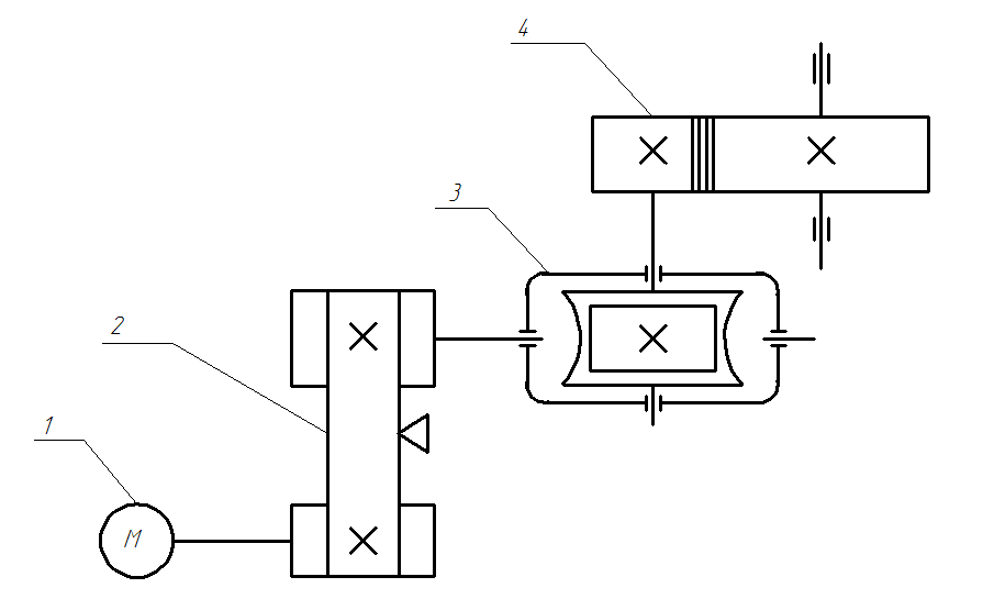 1. Электродвигатель 2. Передача клиновидным ремнем 3. Червячная передача 4. Зубчатая цилиндрическая прямозубая внешнего зацепления Pвых=2,0 кВт