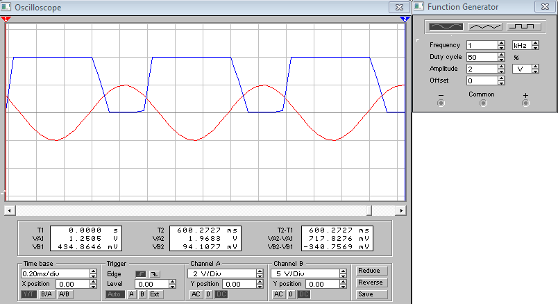 Из временной развертки входного и выходного сигналов очевидно, что транзистор является инвертирующим и работает в режиме усиления. По временной развертке определим коэффициент усиления: