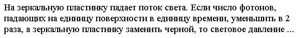 10. Солнечный свет падает на зеркальную поверхность по нормали к ней. Если интенсивность света равна 1,37 кВт/м2, то давление света на поверхность равно … (Ответ округлите до целого числа и выразите в мкПа).
