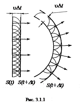 3.1. Явление дифракции света и условия ее наблюдения. Принцип Гюйгенса − Френеля. 3.2. Метод зон Френеля. 3.1. Явление дифракции света и условия ее наблюдения.Принцип Гюйгенса − Френеля. Дифракцией света называется совокупность явлений, которые обусловлены волновой природой света и наблюдаются при его распространении в среде с резко выраженной оптической неоднородностью. В более узком смысле под дифракцией света понимают огибание светом встречных препятствий, т.е. отклонение от законов геометрической оптики. Например, при прохождении через отверстия в экранах, вблизи границ непрозрачных тел и т.д.. Различают два вида дифракции света: 1) дифракция Френеля (дифракция в сходящихся лучах); 2) дифракция Фраунгофера (дифракция в параллельных лучах). В первом случае на препятствие падает сферическая или плоская волна, а дифракционная картина наблюдается на экране, находящемся за препятствием на конечном расстоянии от него. При дифракции Френеля на экране получается «дифракционное изображение» препятствия. Во втором случае на препятствие падает плоская волна, а дифракционная картина наблюдается на экране, который находится в фокальной плоскости собирающей линзы, установленной на пути прошедшего через препятствие света. При дифракции Фраунгофера на экране получается «дифракционное изображение» удаленного источника света. Решающую роль в утверждении в начале XIX в. волновой теории света и ее дальнейшем развитии, позволившем, в частности, объяснить дифракцию света и дать методы ее количественного расчета, сыграл О. Френель. Ему удалось также показать, что закон прямолинейного распространения света является приближенным. Оказалось, что этот закон, а также и вся геометрическая оптика абсолютно точны лишь в пределе - при длине волны света l®0. Х.Гюйгенс сформулировал правило, называемое принципом Гюйгенса (1678), которое позволяет найти положение фронта волны в момент времени t+Dt, зная егоположение в предыдущий момент времени t и скорость волны u. Согласно этому принципу, все точки поверхности S(t), через которые проходит фронт волны в момент времени t, следует рассматривать как источники вторичных волн, а искомое положение S(t+Dt) фронта в момент времени t+Dt совпадает с поверхностью, огибающей все вторичные волны. При этом считается, что в однородной среде вторичные волны излучаются только вперед, т. е. в направлениях, составляющих острые углы с внешней нормалью к фронту волн. В однородной изотропной среде вторичные волны — сферические (рис.3.1.1).